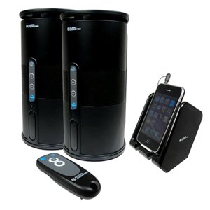 The AURA Speaker System's bass boost feature provides deep, rich bass tones for a more powerful sound, while the stereo widening feature creates a three-dimensional soundscape. It runs on four AA batteries for up to 10 hours of continuous playback, and it can also be plugged in via the included AC adapter.